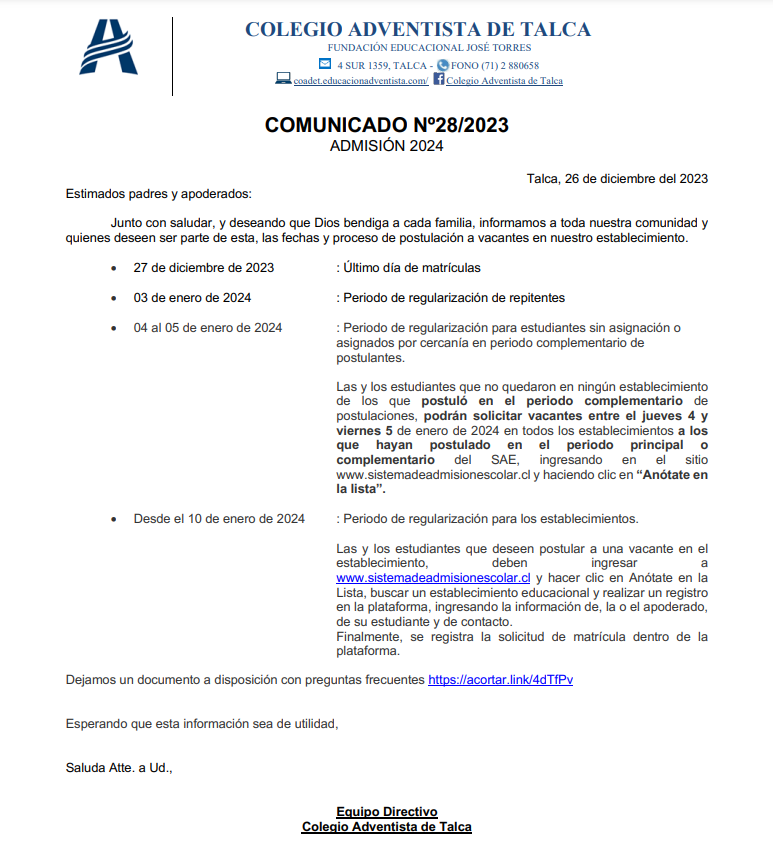 Uniforme oficial del colegio adventista de Talca